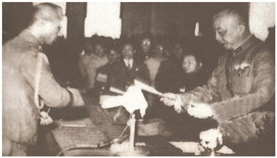 1945年10月25日,中国战区台湾省受降主官陈仪(右一)接受日本投降代表的投降书。