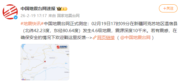 中国地震台网正式测定:02月19日17时09分在新疆阿克苏地区温宿县(北纬42.23度,东经80.64度)发生4.6级地震中国十大配资app,震源深度10千米。