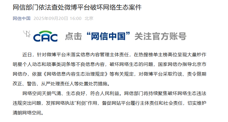 近日,针对微博平台未落实信息内容管理主体责任,在热搜榜单主榜高位呈现大量炒作明星个人动态和琐事类词条等不良信息内容,破坏网络生态的问题,国家网信办指导北京市网信办,依据《网络信息内容生态治理规定》等有关规定配资平台哪家正规,对微博平台采取约谈、责令限期改正、警告、从严处理责任人等处置处罚措施。